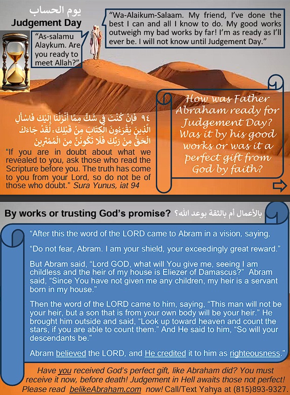 The Qur’an and the Scripture make it very clear, the Judgement Day is coming for each person on the earth. One must be righteous and perfect by God’s standard, to enter the Paradise by which He has created. Are you ready for Judgment Day? Have you received the gift God has done, as a result of the all-sufficient and satisfying sacrifice that God accepts from what Jesus has accomplished? Remember, Abraham offered his son for sacrifice but instead, God provided a ram! So also, we should have paid for our sin but God’s Messenger Isa / Jesus took our place!